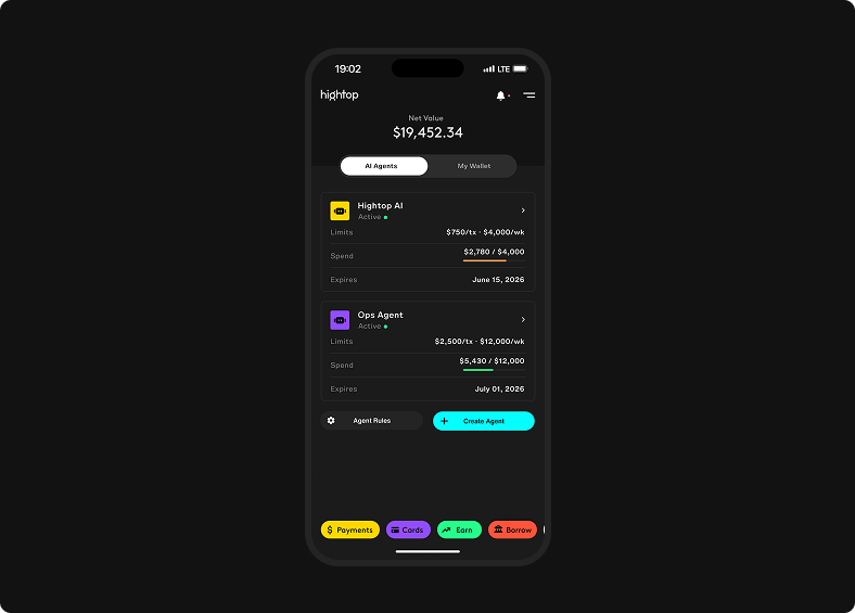 - Idle funds earn yield through Hightop Earn until the moment an agent needs to spend them