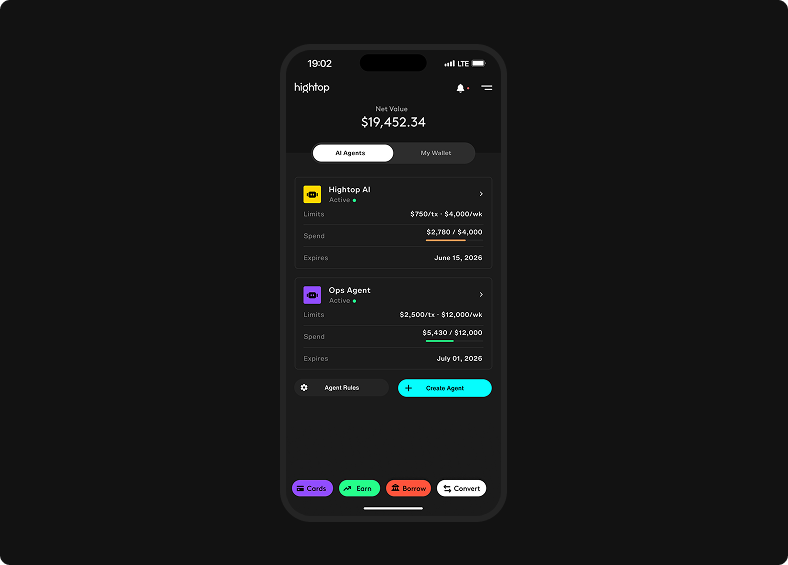 Sometimes you do not need to add new money or move anything out. You just need to shift capital that is already inside Hightop, rebalancing between cash, supported assets, and yield positions from the same account your agents already use. Convert is the workflow for that.